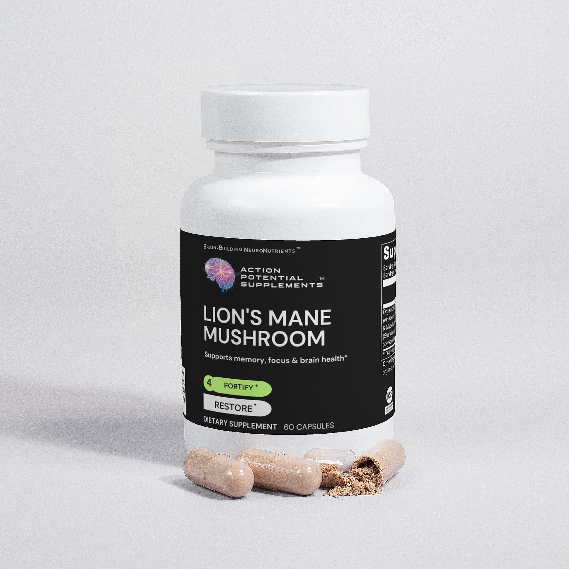 Ingredients: Organic Lion’s Mane (Hericum erinaceus) Mushroom Fruiting Body & Mycelium Powder (Standardized to 40% polysaccharides [400mg]), Vegan Capsule (modified cellulose, water).